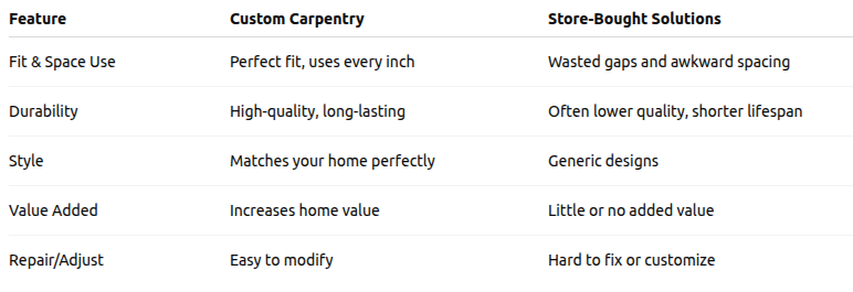 Comparison Table: Custom Carpentry vs. Store-Bought Solutions